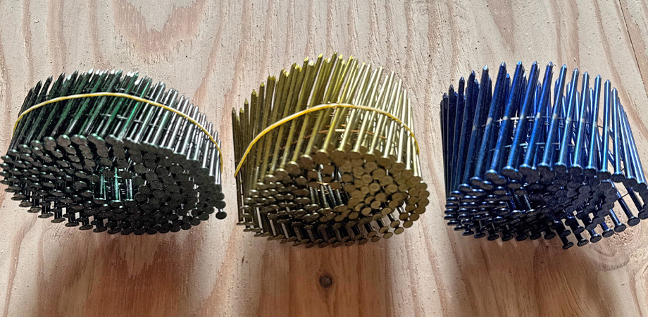 建築現場をのぞいてみると、青・金・黒など、カラフルな釘が使われています。